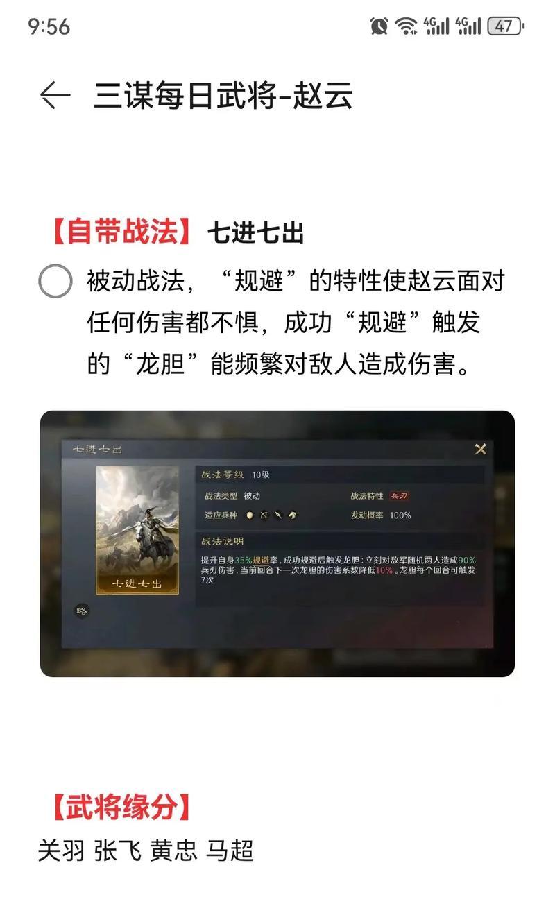 三国志游戏是一款深受玩家喜爱的策略游戏,其中赵云作为一位重要的武将,拥有强大的技能,能够在战场上扭转乾坤。本文将详细介绍赵云的技能,并给出相应的使用策略,希望能够帮助玩家更好地利用赵云的能力,取得游戏中的胜利。