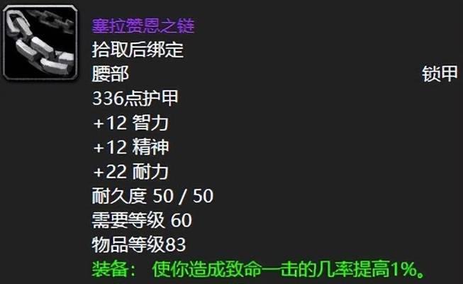 再来看腰部装备。在黑翼之巢中,术士需要使用克洛玛古斯,黑暗之神的束带,因此需要选择具有法术伤害加成和暗影法术伤害加成的腰部装备。建议使用炽燃腰带。