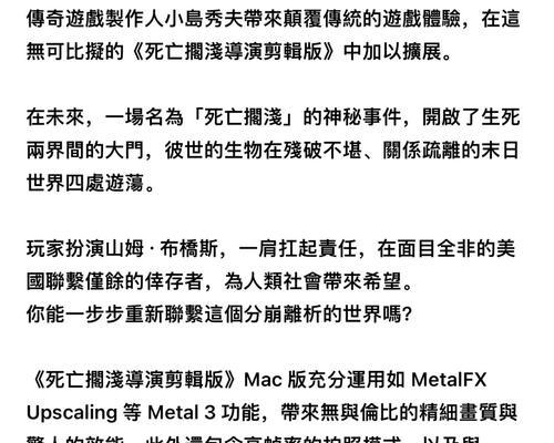 “全面解析《死亡搁浅》玩法及攻略(深入探究《死亡搁浅》游戏的特色和技巧,帮助玩家更好地体验)(死亡解读)” 的相关文章